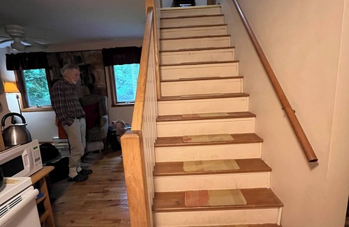Although rustic looking, this modern well insulated cottage is only 30 years old and can sleep up to 8. There are two upstairs bedrooms, one with a king size bed with a posturepedic mattress, the other with 2 twin size beds. A fold out couch/futon is in the living room, and a futon with mattress is in the front enclosed porch room used in the summer months.