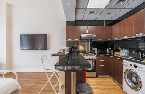 Our charming studio apartment features a contemporary design with warm, inviting interiors