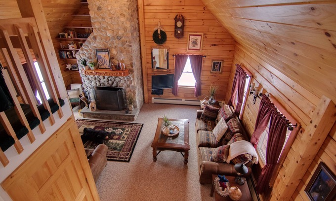 Fantastic views right from the front porch with a morning coffee or sunset glass of wine. Located just outside of town, up on the mountainside, the Happy Cabin affords the perfect balance of access to White Mountain amenities and the towns charms yet off by itself for added peace and quiet seclusion.