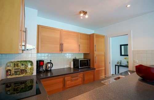 Leading off from the living room is the open plan kitchen. It is equipped with a fridge/freezer, full size oven, ceramic hob, microwave oven, dishwasher, toaster and coffee machine. There is an ample supply of glasses, crockery, cutlery, pans and all other kitchen essentials.