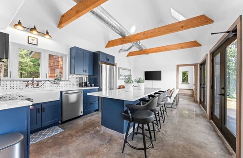 This beautifully designed cabin features a spacious open floor plan, modern amenities, and large windows that flood the space with natural light and showcase breathtaking views of the Arkansas Grand Canyon. The fully equipped kitchen includes everything you need to prepare a delicious meal, and the large kitchen island flows seamlessly into the living room—an ideal setup for gathering, relaxing, and taking in the panoramic scenery.