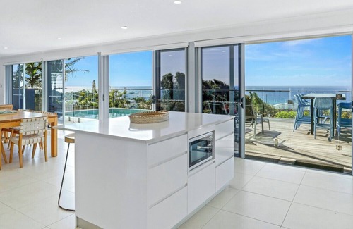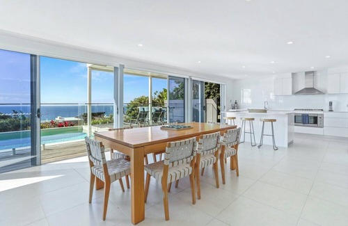 Glass sliding doors open onto the deck, where you can enjoy oceanfront outdoor entertaining, a large pool, and glass-edged poolside decks with sun lounges. An 8-person outdoor bar-style seating and dining area with a Weber BBQ make this space perfect for entertaining.