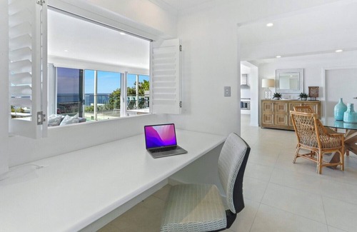 Two additional bedrooms are also on this level, one with a queen bed and the other with two single beds, both with mirrored robes. The central sitting area holds a desk, with the main bathroom with ocean views and a built-in bath provide additional comfort.