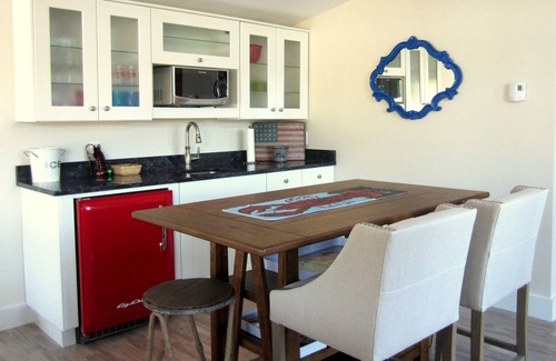 Guest Cottage: Once on the dock, the Pilot House (which serves as the guest house) is immediately in front of you. The Pilot House is a little more traditional in nature, with its decorative theme 'nouveau nautical.' The Pilot House features a second living room, which is perfect for watching movies and Red Sox games, it's own pub, a bedroom with a queen sized bed, and a full bathroom with tub/shower and separate water closet. Like the Boathouse, the Pilot House is adorned with various clever decorative elements including a retro red bar refrigerator, two 360 degree swivel chairs and a custom made mermaid shower curtain. This is the fun get away part of Waterlot, as noted on a sign hanging on the wall that reads; 'Work like a Captain; Play like a Pirate.'