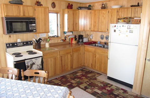 Recently updated, this 2,000 sq. ft., 4 bedroom, 2 bathroom home sleeps 13 comfortably and features both an open layout and walk out basement on the lakeside. The well stocked kitchen includes a full size refrigerator, range, microwave, traditional drip coffee maker, K-cup coffee maker (bring your K-cups!), electric kettle for tea, toaster, pots & pans, slow cooker, waffle maker, plenty of dishes, utensils, spices along with a walk in pantry, and seating for eight. The kitchen and dining room open up to the spacious living room and entertainment center making it the perfect place to spend time together as a family. The modern tiled entry leads to carpeted floors which are highlighted by paneled tongue and groove aspen walls throughout the home for that Northwoods rustic charm with plenty of space for large families to gather or find quiet areas to enjoy. Acessed from the great room is a massive deck with a wrap around walkway and steps that lead out to the water. Relax on the deck, the downstairs patio, or the outdoor fire pit and enjoy the famous Michigan sunsets. No people, no regrets, just perfect solitude! Sit on the beach all by yourself and listen to the loons or watch the fish jump at the end of the dock. Then, put out the camp fire and crawl into bed with fresh, pure cotton sheets... Imagine...no one's going to bug you, no phone calls, no hassles.... all day long.