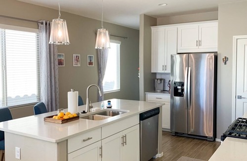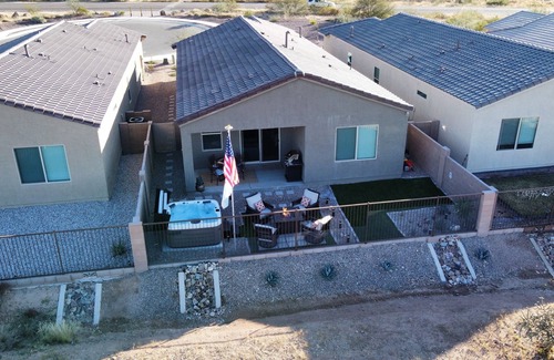 New development built in 2020, part of the Rancho Del Lago Reserve community. We are located on hole number 9 of Del Lago golf course. The floor plan is very open and spacious with the kitchen, dining room, and living room all in one space. We have 3 very beautiful bedrooms. One king bedroom (master), queen bedroom, and bunk bed room with a full and twin. We have 2 office spaces with monitors included. The back yard is fabulous with a gas fire pit, cactus garden, grill, hot tub, and putting green! We hope you love this house as much as we do!