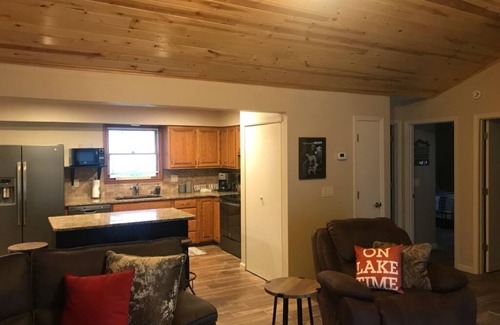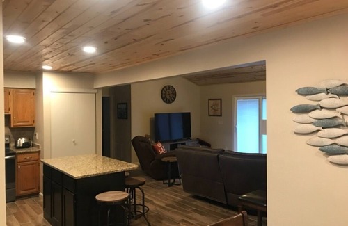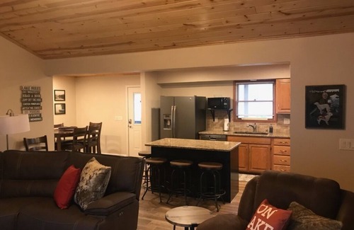 The open concept living space includes a beautiful modern kitchen with a dining table that seats 6 and a large island that seats 4, ideal for snack and meals. A high-chair is available as well if needed. The fully equipped kitchen opens to spacious family room with a large very comfortable reclining sectional couch, plus a separate recliner that looks straight out to the lake. The room is great for watching movies on DVD (over 50 provided for all ages), Netflix, Amazon and Hulu, or playing the many board games we have provided with your family and friends. There is a cornhole set as well.