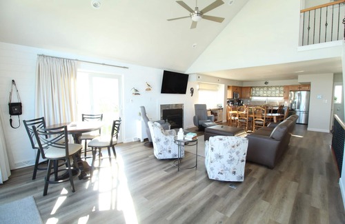 GORGEOUS RENOVATED BEACHFRONT! Beautiful home with fantastic ocean and bay views! Features 5 big bedrooms (2 ensuites), 4.5 baths plus outside shower, 3 decks, huge great room. Beach access only steps away. Quiet location. Completely renovated in 2003 A real "show piece" directly on the beach! This home is spacious, has fantastic views, but is also very homey and comfortable. Garage and den on ground level. 1st floor features 4 bedrooms 2 full baths, front bedroom is an ensuite with private deck. 2nd floor features spacious "Great Room" with a gorgeous fully stocked kitchen, large front deck, and a powder room. 3rd floor is 2nd ensuite bedroom with jacuzzi tub and private deck. Book this unit today!! Stair lift to ground level and 2nd floor.
