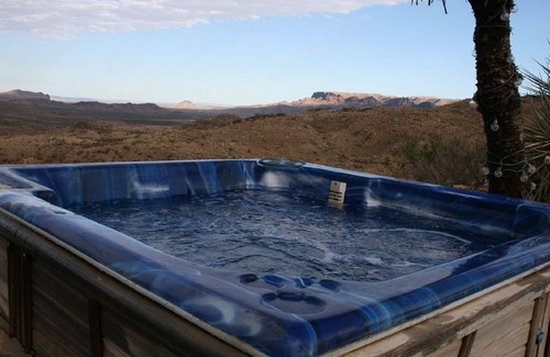 ............Spectacular mountain views and great sunsets Tarantula Ranch is located over a hill about two miles from the nearest paved road." Experience life at the end of the road" inside a 320 acre compound. Tarantula Ranch sharpens your senses,the wildlife,the views,the smells,peace and quiet and of course the stars. TARANTULA RANCH has some of the darkest skies in the world. In the warm months its nice to sit on the front porch and have coffee with Billy and Maggie two friendly burros who like interacting with our guests,although you may have to share (they are the worlds biggest beggars). Tarantula Ranch has two cabins.The four room cabin can sleep six and the one room cabin sleeps two( although i did have a family of two adults and three children stay there a few times for a week). Both cabins have real "on the grid electricity",hot showers, toilet,septic tanks that work,kitchens furnished with stove,refrigerator,hot plates,convection oven, coffee maker,microwave etc.All linens and towels are furnished.We also have wifi and direct satellite tv with hbo and showtime,propane gas heaters for winter and refrigerated air conditioning for summer. We are about ten minutes from one of the prettiest swimming pools in Brewster county, Texas. With both cabins we can sleep a party of eight(although i have had ten there a few times but someone will have to sleep on a blow-up mattress or sleeping bag on the floor.) If you are only one person traveling alone or a couple and the large cabin is rented by someone else you can rent the detached cabin as a separate party. The detached cabin has a queen size bed,kitchen,indoor shower and toilet and satellite tv. You will have to contact me regarding the availability of the detached cabin. In addition to property here at the compound Tarantula Ranch llc also has other properties in the area. One in particular is at a lower elevation (warmer) for our winter time sunworshipers. It's common to have 75 to 80 degree days there in the winter. That property also has pictographs both Indian and Spanish. I have a jeep and a 4 wheel drive suburban that i can take people on a tour to my various properties to see how people have lived in the Big Bend from 8000 years to present with a little geology thrown in. You can sign up for that when you make reservations.If you are a golfer, as a member of The Lajatas Country Club, i can save you 20% off your green fee. At the end of a day of playing in the big bend it's nice to kick back with a drink in our hot tub that sits on a cliff facing west, listening for coyotes and looking for shooting stars. We also have an observation deck that hangs out over that same western cliff that the hot tub is on. The big bend has some of the darkest skies in the world. Here at Tarantula Ranch you are an easy drive( by west Texas standards) to all the tourist attractions in the area,the national park, the state park,river rafting outfitters,horseback riding,jeep tours and the Terlingua ghosttown where good food, good drinks,good music and good times are alive and well.
