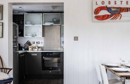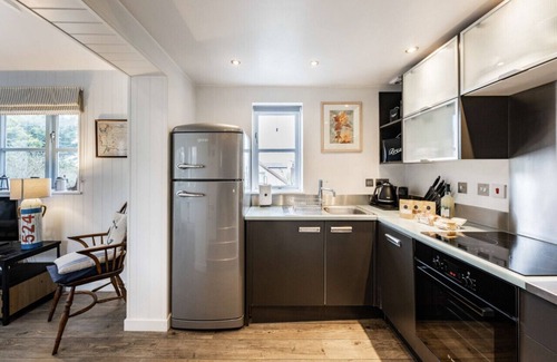 The light and bright living space has French doors leading out onto the decked garden so indoor/outdoor living can be enjoyed in the summer months. Plenty of comfortable seating surrounds a wood burner so in the coastal views can still be enjoyed from the comfort and warmth of your property during the winter months! A dining table seating four sits in the corner of the room and a Smart TV is provided with access to apps with your own subscription.