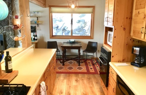 The roomy open kitchen faces the mountains and has barstool seating, updated appliances, a gas cook top and every cooking tool needed for making any type of meal. Mixing bowls, serving dishes, plates and glasses are in abundant supply. There’s an adjoining pantry for extra food storage. Common spices, miscellaneous condiments and paper goods are supplied. The dining table expands for additional seating with its own rocky mountain deer trail view.