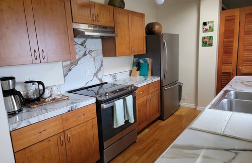 Main house Upstairs has private entry and exclusive use of hot tub and lanai. There are three bedrooms and two baths, a fully equipped kitchen , dining area with seating for 6 people. Open lanai has a hot tub for relaxation after a long day enjoying the sights.