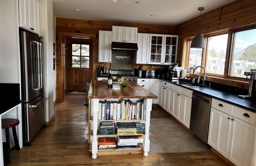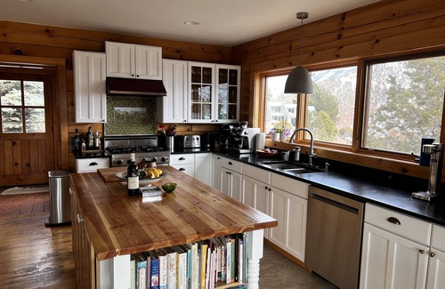 A lovely lodge perched high above charming Basalt village, overlooking the confluence of the gold medal Frying Pan and Roaring Fork Rivers, with beautiful views of 13,000 foot Mt. Sopris to the west and the Roaring Fork Valley to the south. The Lodge has four lovely bedrooms and sleeps 10. The kitchen is well-appointed with a Viking range for those who love to cook at home, but if not, a handful of restaurants serve hearty and fancy fare in Basalt, a 2 minute drive or a healthy stroll down the mountain. The wrap-around deck provides glorious views, and southwestern exposure means bright sun all day and spectacular sunsets in the eve. The Lodge backs up to the White Mountain National Forest, which is laced with hiking trails, and it is located minutes away from some of the best trout fishing in Colorado, and 20 minutes from the Aspen/Snowmass ski mountains and the Aspen Airport. Amenities include hot tub, heated garage, gas fire place, wifi, wall mounted TV screens, fully equipped kitchen, washer/dryer and grill.