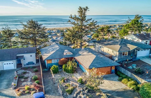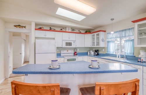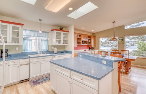 The attractive exterior and exotic plantings outside this Waldport ranch home hint at the wonders inside. You’ll walk into a sky-lit hallway with blond hardwood floors and artful decor. The great room has a vaulted ceiling with a fan and large windows opening to a stunning view down to the ocean. A pellet stove stands ready for cozy evenings, and a TV/DVD and stereo/CD player promise to keep you entertained. The cheerful, fully equipped kitchen benefits from skylights and an island breakfast bar; the dining area has a superb ocean view. There’s a nice queen bedroom and a spacious king with TV and a full bath with a tiled walk-in shower. Sliders from the bedroom open to a large Trex deck and an ocean-view. Located in a quiet neighborhood minutes from town and the beach, Pacific Ocean Blue gives you an excellent launching pad to all the sights and activities on the central coast. You’ll also enjoy access to the seasonal pool for a small fee at the Bayshore Beach Club, plus the neighborhood playground and tennis courts. Give yourself the rejuvenating gift of beautiful surroundings and a top-of-the-world view on your next trip to the beach!
