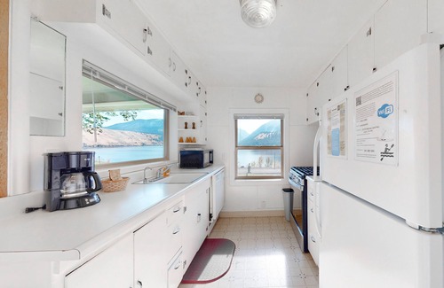 The breakfast nook is a great place to sip your morning coffee and watch the lake. The kitchen is galley-style but has all the modern conveniences you'll need to prepare your meals. Step past the kitchen into the larger dining room with more great views of Wallowa Lake.