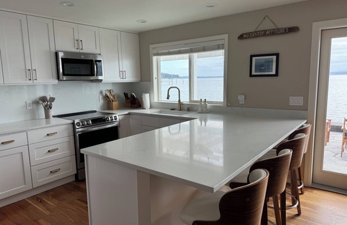 This luxurious, family-friendly walkout, beachfront home on Mutiny Bay has been recently renovated and newly furnished. It is the perfect Whidbey Island get-away to relax and enjoy the beauty of the Puget Sound. This spacious, 2,500 square foot four bedroom, three bathroom home can sleep 12 comfortably. There are two queens, one king, four twins, and a very comfortable queen sofa bed. It is a great home for families, including grandparents as they can use a downstairs bedroom and bathroom and walk straight out to the beach (sand, not rocks!) without navigating a lot of steps.