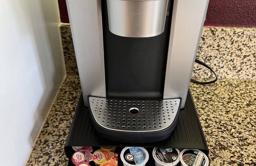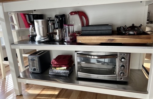 A Bright and cheery open concept kitchen with island . Large pantry , great lighting and French doors off the kitchen . The kitchen is fully stocked with Keurig coffee machine and pods included . You will find all your cooking essentials with rice cooker, insta pot , crock pot , just to name a few .
