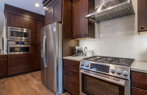 This stunning 2-story vacation home is perfect for gathering with friends and family. With ample space to spread out and relax, the entryway living area boasts tall ceilings, gorgeous natural lighting, and a cozy fireplace. A secondary living space provides a plush couch and leather rocking chair around the TV and fireplace. Movie lovers will adore the large TV and sectional couch in the dedicated TV room. The gourmet kitchen is fully equipped with high-end appliances and stylish cabinetry. Cook like a pro with the Bosch steam convection oven and enjoy breakfast at the 4-stool breakfast bar. An 8-seat dining table provides the best spot for a sit-down meal, while the 4-chair table is excellent for a quick bite. Treat friends to a drink from the wine refrigerator at the separate wet bar off the kitchen. When it's time to relax, step outside to the expansive deck, soak in the hot tub, or savor a meal grilled to perfection at the alfresco dining table. Retreat to the inviting guest bedroom on this floor with a cozy queen-sized bed and shared bathroom. There's also a laundry room for convenience.