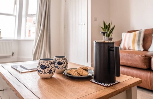 There are steps up to the front door of this elegant townhouse to give it an elevated position to make the most of the uninterrupted sea views. You step into the hall and the stylish lounge with beautiful karndean flooring is on your right, with 2 comfortable sofas and a smart TV. Light fills the room through the big bay window which overlooks the beach and sea. The famous Martello Tower can also be seen in front of the house.