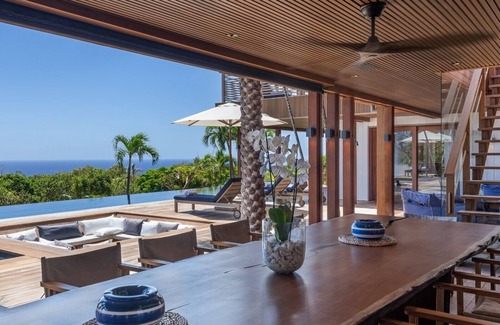 Outdoors, the long terrace runs along the facade of the villa with a beautiful wooden deck and seating areas. It features a heated infinity poolthat sparkles in front of the ocean, overlooking the lush garden. There are sunbeds and umbrellas for pleasant sunbathing sessions, close to the deck's built-in jacuzzi, where you will enjoy relaxing in the tropical beauty.