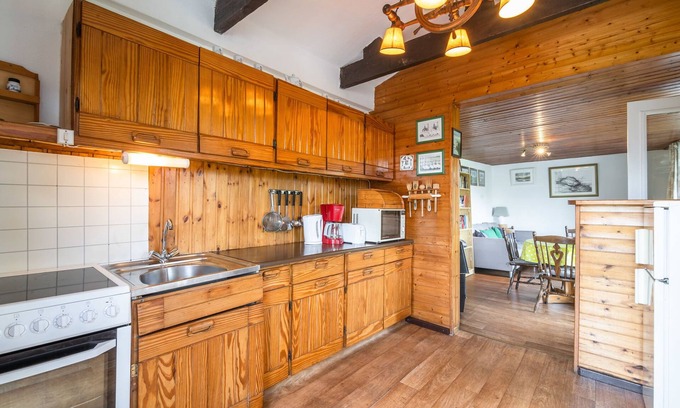 The chalet rests in an extremely peaceful location, just next to the forest. Restaurants can be found at 2 km while the supermarkets and town center are at 3 km. You also have cross country trails 2 km away. There is a lake at 5 km for a pleasant day out with the whole bunch.