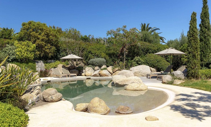 Enjoy a villa with an exceptional pool surrounded by rocks and a beautiful garden filled with trees and flowers.