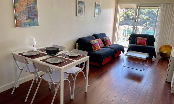 LOGEMENT RÉNOVÉ AU 1ER SEMESTRE 2024 - Splendide appartement situé à Collioure, direction Port-Vendres, dans la résidence « Les Batteries ». Ce logement, baigné de lumière, propose une magnifique vue sur la crique située à ses pieds et sur le clocher emblématique de Collioure. Il dispose de plus d'une décoration raffinée et contemporaine ainsi que d'équipements et matériaux de qualité.