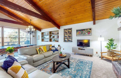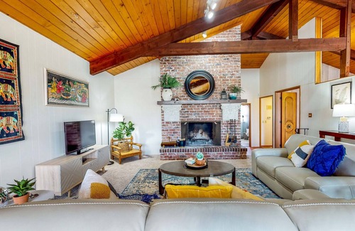 Inside, bohemian artwork, wood and brick finishings, vaulted ceilings, and soft furnishings make this space what it truly is. Lounge in the sunny living room while tuning into your favorite TV show or movie, all while being warmed by the heat of the fireplace. When you're feeling playful, engage in some light-hearted competition over the adjacent Ping-Pong table. An additional upstairs seating room ensures everyone has the space to visit and lounge.