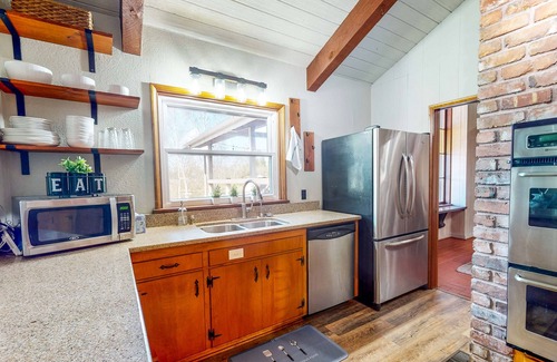 Inside, bohemian artwork, wood and brick finishings, vaulted ceilings, and soft furnishings make this space what it truly is. Lounge in the sunny living room while tuning into your favorite TV show or movie, all while being warmed by the heat of the fireplace. When you're feeling playful, engage in some light-hearted competition over the adjacent Ping-Pong table. An additional upstairs seating room ensures everyone has the space to visit and lounge.