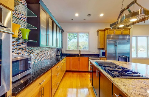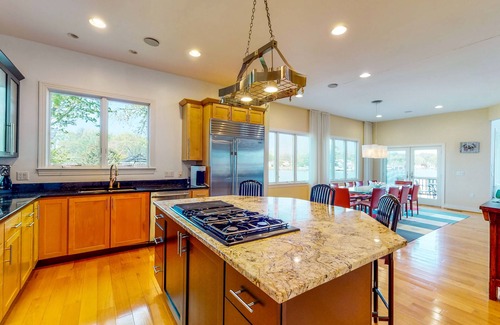 The full kitchen provides a pleasant place to cook amongst the suite of stainless steel appliances, a center island, and gleaming countertops. Be sure to cheer to vacation at the separate wet bar, and when it's time to eat, dine at the sprawling formal dining table, or alfresco on the home's deck.
