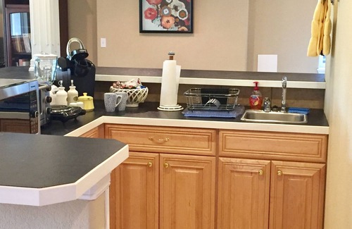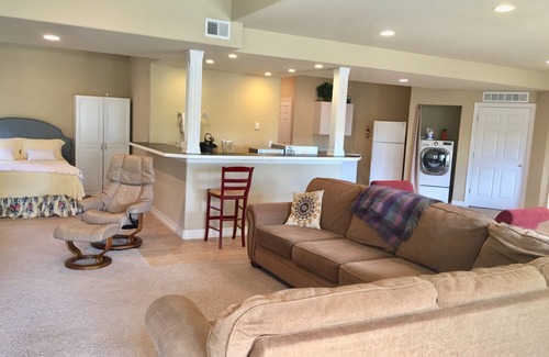 Sectional sofa can provide additional sleeping area. Fully outfitted kitchenette with Keurig, blender, microwave, toaster oven, bar sink, new washer/dryer unit. There is private outdoor dining space with an infrared gas grill. Main bedroom has a large walk in closet. Living area has 42” flat screen tv and an additional tv in bedroom. We have exterior security cameras for the protection of our home and guests. These do not record sound and are not in the interior of the suite.