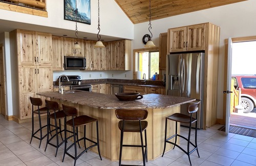 The Spring Creek Lodge offers spectacular views of 3 different mountain ranges in Livingston Montana. This beautiful new lodge, built in 2015 can comfortably sleep up to 14 guests and offers many amenities such as Wifi, Cable TV, outdoor grill, modern kitchen, washer and dryer, hot tub and fire pit on outdoor patio. Let us set you up for an unforgettable family vacation. Yellowstone National Park is just over an hour south of the lodge and the outdoor activities are endless! We offer a master suite upstairs with a King Size bed, its own private balcony and a large master bathroom featuring a Jacuzzi Tub, separate shower and his and her sinks. The main floor consists of a spacious kitchen with island, large dining room table with a vaulted ceiling, great room with entire wall of picture windows for incredible views of the Bridger mountains and Shelds River Valley for all to enjoy.