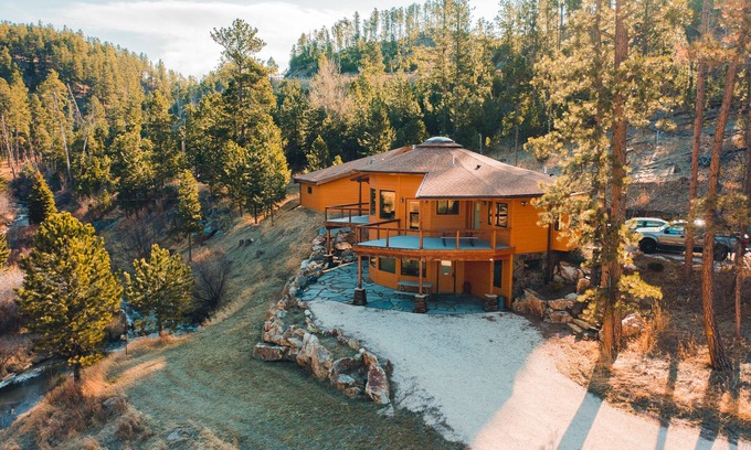 This circular shaped structure is a "Mandala" kit home and fits into this alpine hillside beautifully. The cozy furnishings and natural Black Hills slate gas fireplace will help you relax after a day enjoying the historic sites and unforgettable adventures which abound in the Black Hills of South Dakota.