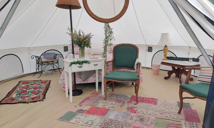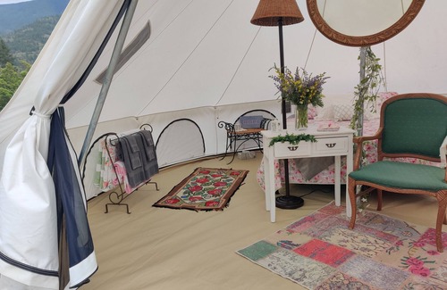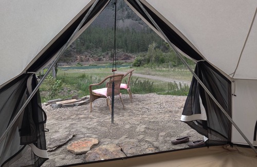 Peace of Paradise is what you'll find in 1 of our 5 quaint and cozy Glamping tents along the river, overlooking the spectacular river views! It's surreal beauty from every angle, tranquil peace and calm! A short walk takes you to the rivers edge where Bass and Pike are a delight to every fisherman! Your experience includes, but is not limited to, an open fire pit for cooking, table and chairs for eating, drinking water, dishwater, river and mountain views from your site, lamps, phone charger port, shared shower house and clean porta potties. Kayaking, paddle boarding, swimming and relaxing are a few of the charming delights just out your front door. Can't pull yourself away from the glacier blue river views, the charming old fruit trees in the lawn and the cozy campfire at night! Experiencing the western trains rumbling down the valley is a highlight to many campers. (There are no Railroad crossings or air horns near our property.) Just a short 2 miles down the road, a mineral soak awaits you at Quinn's Hot Springs Resort. You can also enjoy a cute, best in the west ice cream shop ten minutes away in the town of Wild Horse Plains, a darling old town which also hosts antique shops, grocery, hardware, hospital and so much more! The old and fascinating town of Thompson Falls and a local Bison range, are less than an hrs drive away!
