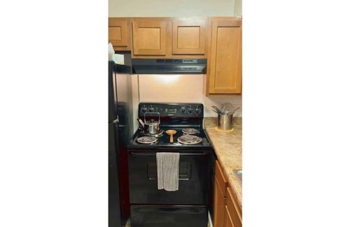 Kitchen has toaster, Keurig (complimentary coffee & tea provided) microwave, oven and stove with all the cooking essentials (pots, utensils, seasonings…)