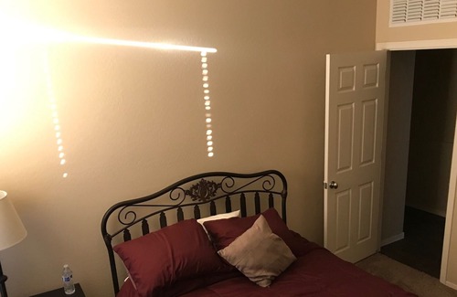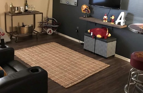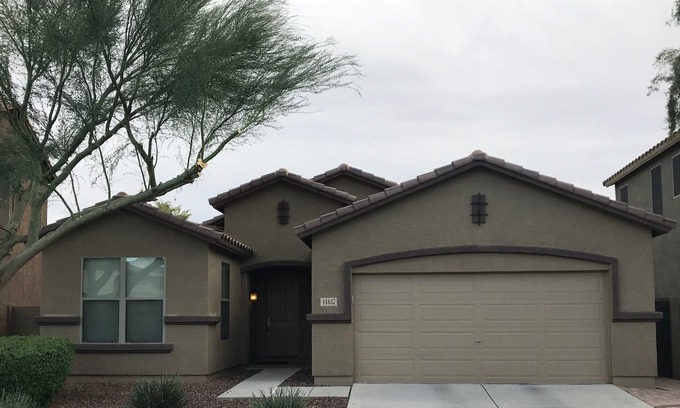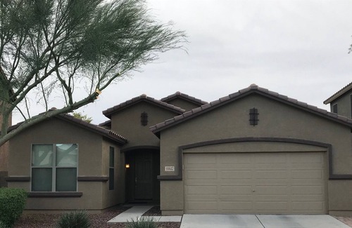Nice 3 bedroom/2 bath in a quiet North Peoria/Sun City neighborhood. Approx 15 minutes from Surprise Stadium and 20 minutes from Peoria Sports Complex. Very close to over 10 golf courses including Trilogy at Vistancia and Corte Bella Golf Club. 3 bedrooms total, 1 bedroom is set up as workout room with a treadmill, weight bench and dumbbells. The house has a 2 car garage. There is a "man cave" with a full bar. The backyard includes a big patio with a grill, outdoor furniture, and a fire pit.