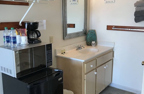 The room features 2 full size beds, small fridge, micro wave and coffee pot.