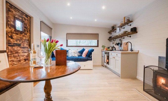 As you step inside, you're greeted by a spacious interior with a rustic charm. The focal point of the living area is the log burning stove, perfect for cozying up on cooler evenings while gazing out at the views of the surrounding woodland and moorland. With fast internet access, you can stay connected to the outside world while immersing yourself in the peaceful area of nature.