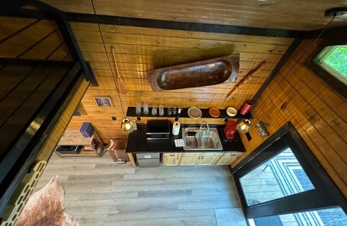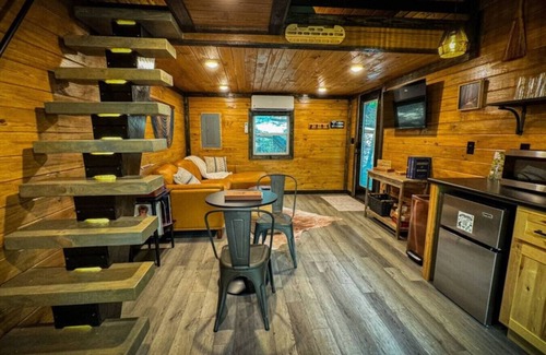 Squirrel Kit is one the areas first tiny cottages situated on a hillside in the woods! Reconnect with nature that completely surrounds you, as you take in the 30-foot drop, off the back deck at this unforgettable escape. It is a cozy studio for 2 with a kitchenette and living room. Traverse up the loft ladder steps to find a secluded queen bed with unbelievable views! The real treasure of this cabin is fully immersing yourself in the forest, while enjoying the covered deck with someone you love.