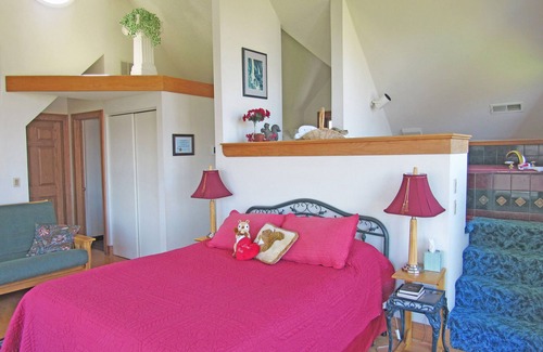 Private, third-story penthouse suite with cathedral ceilings and elevated, jetted tub. A queen-sized bed and queen-sized, futon provide space for a romantic couple or a family.