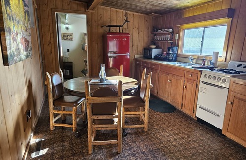 St. Elmo Cabin is a cozy retreat at Deer Valley Hot Springs. With accommodations for up to six guests, this cabin provides an inviting living room where you can gather and relax in front of the fireplace.