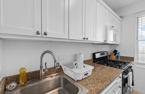 Cook in style in our fully equipped kitchen, featuring granite countertops, a full-sized refrigerator, gas stove, oven, microwave, coffee maker, and all the essentials. Whether you’re preparing a meal or indulging in Chicago’s famous deep-dish pizza, you can enjoy dining with stunning city views.