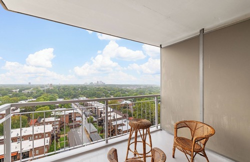 Unwind in the spacious living area with a chic sofa, flat-screen TV, and high-speed Wi-Fi. Step out onto your private balcony to take in beautiful neighborhood views—ideal for sipping morning coffee or enjoying evening relaxation.
