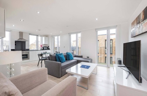 St. Pancras Skyline is a two-bedroom, two-bath apartment with a private balcony and panoramic views.