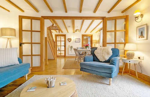 Entering the cottage into the cosy dining room area with a large dining table for four and overlooking the courtyard. The sitting room is open to the dining room and is beautifully decorated with and comfortable sofas and chairs, smart TV and wifi.