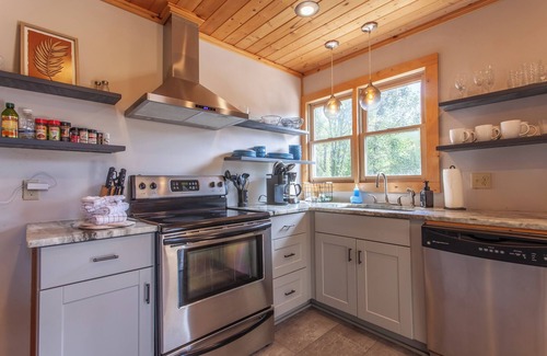 The great room has a full kitchen, including stainless steel appliances (dishwasher, oven, fridge) and a mountain-modern decor featuring a cozy leather couch and stylish reading chair surrounding a flat-panel TV and sleek ribbon-flame gas fireplace. There is a full dining table to spread out a nice dinner or operates as a work space.