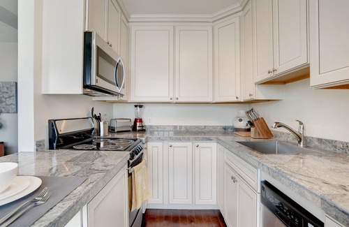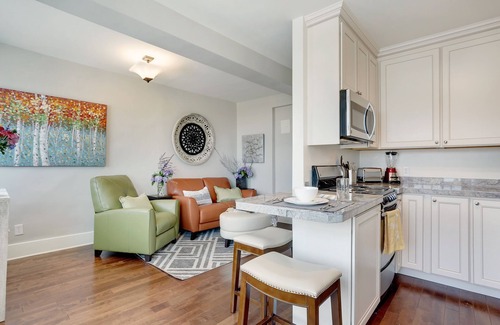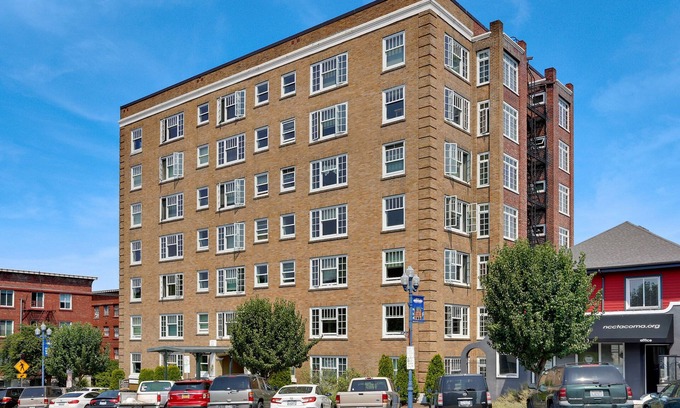 Stay in a beautiful, modern apartment located in Tacoma’s gorgeous , historic Stadium District! The apartment is renovated and fully furnished. It is a studio unit with one bath that sleeps two and has beautiful hardwood floors throughout. There is a small sleeping nook with a queen bed and closet. The kitchen has granite counters, built in dishwasher, microwave dishes and cookware. The apartment includes cable TV, WiFi, heat, linens, towels, games, bike room access and off-street parking. The laundry facility is located just an elevator ride away!