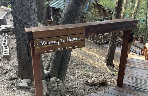 This cabin is not called “Stairway to Heaven” for nothing. From the north side of the cabin (road), it will take you 62 steps to the cabin entrance. However, you can drive up the private driveway on the south side of the cabin, which is 32 steps down to the cabin entrance. You have to drive up a hill to get to the private driveway. The hill may seem steep; however, this is the easiest way to get to the cabin's south side/main entrance; a 4x4 or all-wheel-drive car is recomended.