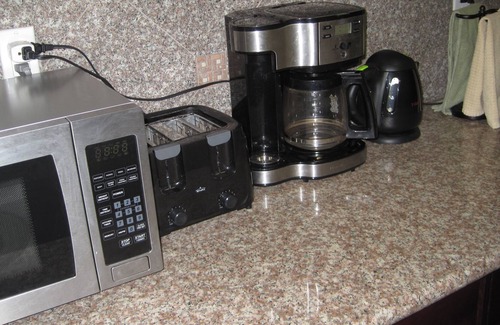 There is also a small kitchen with appliances and a medium fridge with a freezer in the living room and a small fridge under the countertop, microwave, coffee maker, toaster, hot water boiler, and electrical burner to prepare food. All to use to your heart's desire. Silverware, pots, pans, plates, cups, and wine glasses-you name it!
