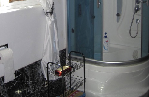 The comfortable tiled bathroom has mirrored cabinets and comes equipped with a cutting edge corner shower that you will love! It has many settings and is just plain cool!